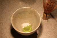 1. Pour Matcha and sugar in the tea cup. Mix matcha and sugar with hot water.