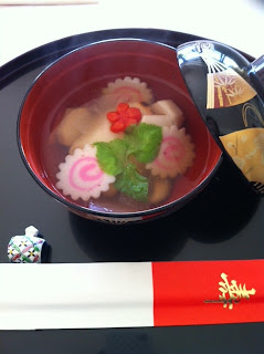 Ingredients are Mochi, Japanese radish, carot, raro, shiitake-brown mushroom, fis paste cake, and chiken with dashi based soup.