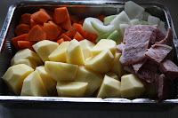 1.Cut potatoes ,carrots and sliced beef in bite size. Slice onions.