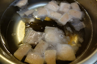 1. Boil 2l water into deep big pan. Put enter pork belly into boiling water and heat medium for about 20 minutes skimming the simmer. Drain Pork belly and cut into bite size. Throw away the boiling water.This porocess is need for reducing the fat of pork belly.