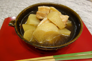 3. Pour dashi, sake, sugar, boiled pork belly and cutted Japanese radish into a deep pan.