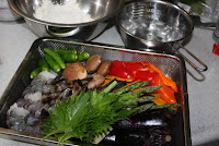 Tempura is fresh seafoods and vegetables that are dipped in batter and deeply fried. You can enjoy the ingredients in season. Please taste with salt or special sauce. The tip for making delicious tempra is to keep water cold before fry ingredients. |